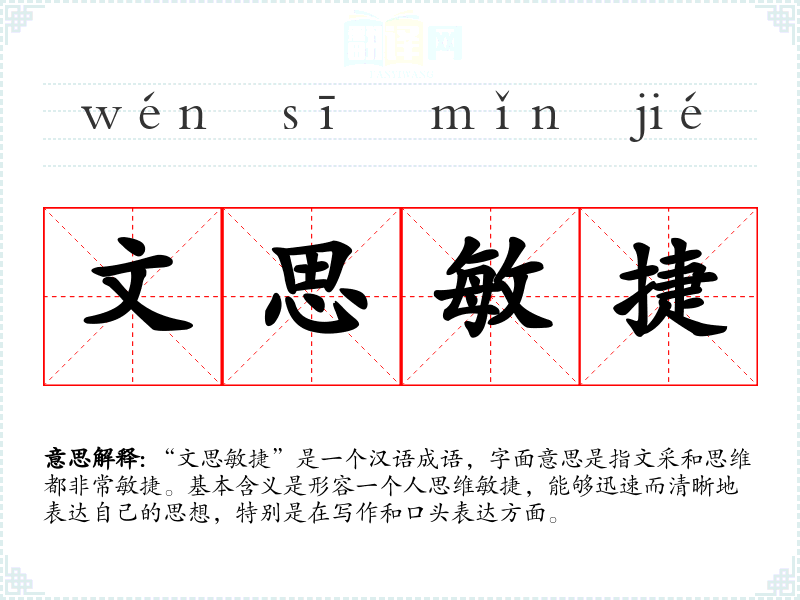 “文思敏捷”是一个汉语成语,字面意思是指文采和思维都非常敏捷。基本含义是形容一个人思维敏捷,能够迅速而清晰地表达自己的思想,特别是在写作和口头表达方面。