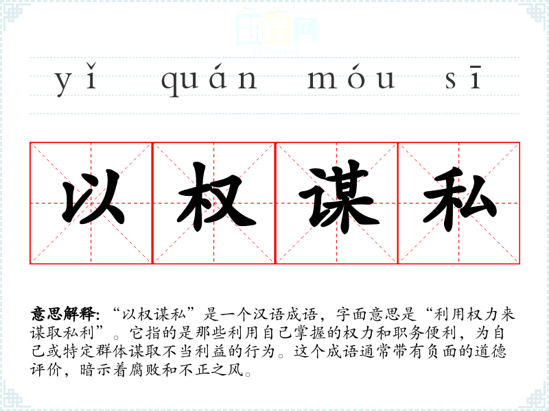 “以权谋私”是一个汉语成语,字面意思是“利用权力来谋取私利”。它指的是那些利用自己掌握的权力和职务便利,为自己或特定群体谋取不当利益的行为。这个成语通常带有负面的道德评价,暗示着腐败和不正之风。
