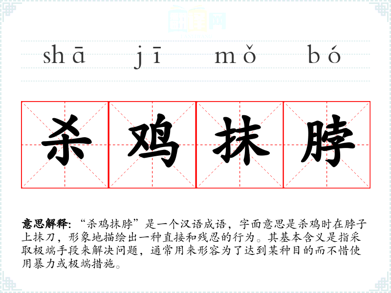 “杀鸡抹脖”是一个汉语成语,字面意思是杀鸡时在脖子上抹刀,形象地描绘出一种直接和残忍的行为。其基本含义是指采取极端手段来解决问题,通常用来形容为了达到某种目的而不惜使用暴力或极端措施。