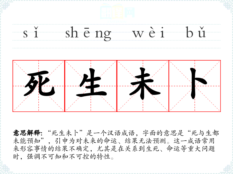“死生未卜”是一个汉语成语,字面的意思是“死与生都未能预知”,引申为对未来的命运、结果无法预测。这一成语常用来形容事情的结果不确定,尤其是在关系到生死、命运等重大问题时,强调不可知和不可控的特性。