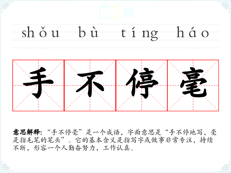 “手不停毫”是一个成语,字面意思是“手不停地写,毫是指毛笔的笔头”。它的基本含义是指写字或做事非常专注,持续不断,形容一个人勤奋努力,工作认真。