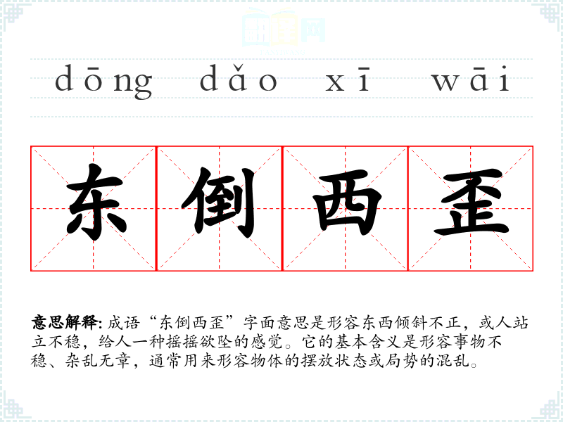 在英语中,类似的表达是“topsy-turvy”,意指混乱或颠倒。虽然两者都传达了混乱的意思,但“东倒西歪”更多地强调了倾斜和不稳的物理状态,而“topsy-turvy”则倾向于描述状况的颠倒和混乱。