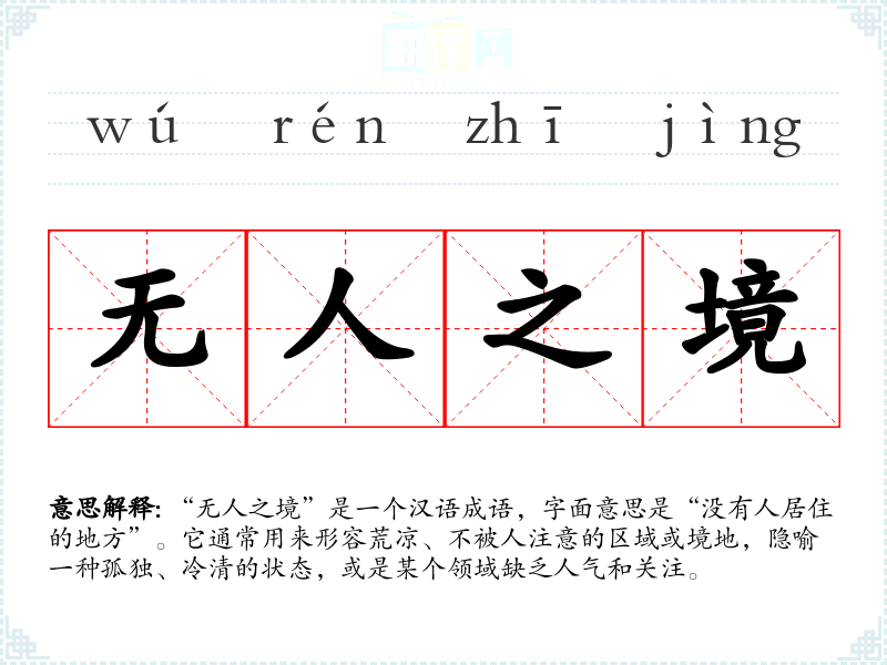 “无人之境”是一个汉语成语,字面意思是“没有人居住的地方”。它通常用来形容荒凉、不被人注意的区域或境地,隐喻一种孤独、冷清的状态,或是某个领域缺乏人气和关注。
