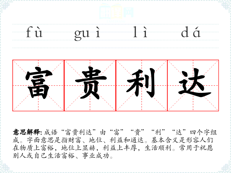 成语“富贵利达”由“富”“贵”“利”“达”四个字组成。字面意思是指财富、地位、利益和通达。基本含义是形容人们在物质上富裕,地位上显赫,利益上丰厚,生活顺利。常用于祝愿别人或自己生活富裕、事业成功。