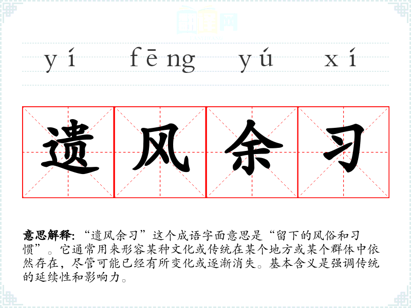 “遗风余”这个成语字面意思是“留下的风俗和惯”。它通常用来形容某种文化或传统在某个地方或某个群体中依然存在,尽管可能已经有所变化或逐渐消失。基本含义是强调传统的延续性和影响力。