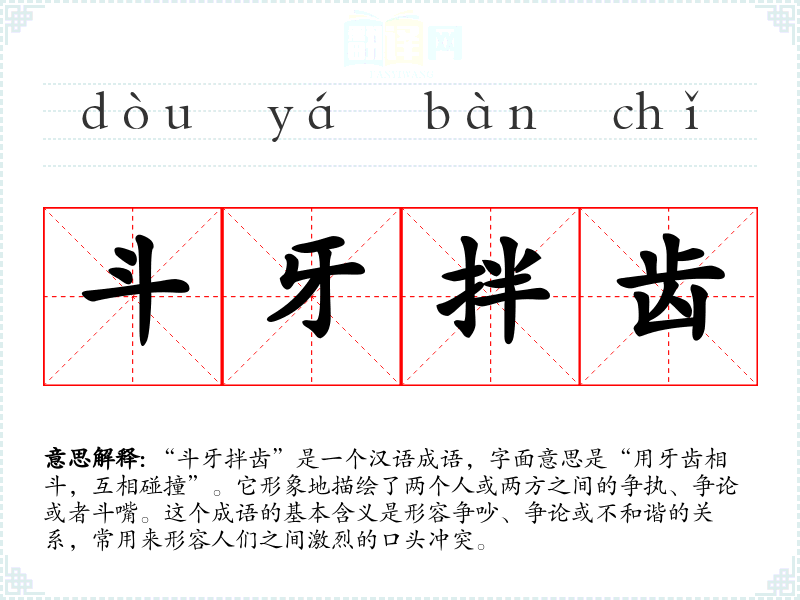 “斗牙拌齿”是一个汉语成语,字面意思是“用牙齿相斗,互相碰撞”。它形象地描绘了两个人或两方之间的争执、争论或者斗嘴。这个成语的基本含义是形容争吵、争论或不和谐的关系,常用来形容人们之间激烈的口头冲突。