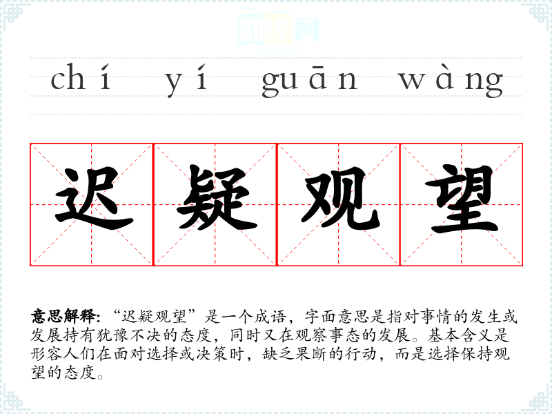 “迟疑观望”虽然没有明确的历史典故,但其构成的两个词“迟疑”和“观望”在古代文献中都有出现。迟疑表示犹豫不决,而观望则强调观察和等待。成语的形成反映了一种普遍的人性特征,在面对不确定性时,往往会选择保持距离,观察局势的发展。
