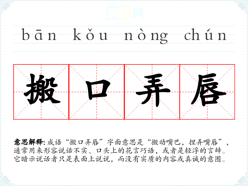 成语“搬口弄唇”字面意思是“搬动嘴巴,捏弄嘴唇”,通常用来形容说话不实、口头上的花言巧语,或者是轻浮的言辞。它暗示说话者只是表面上说说,而没有实质的内容或真诚的意图。