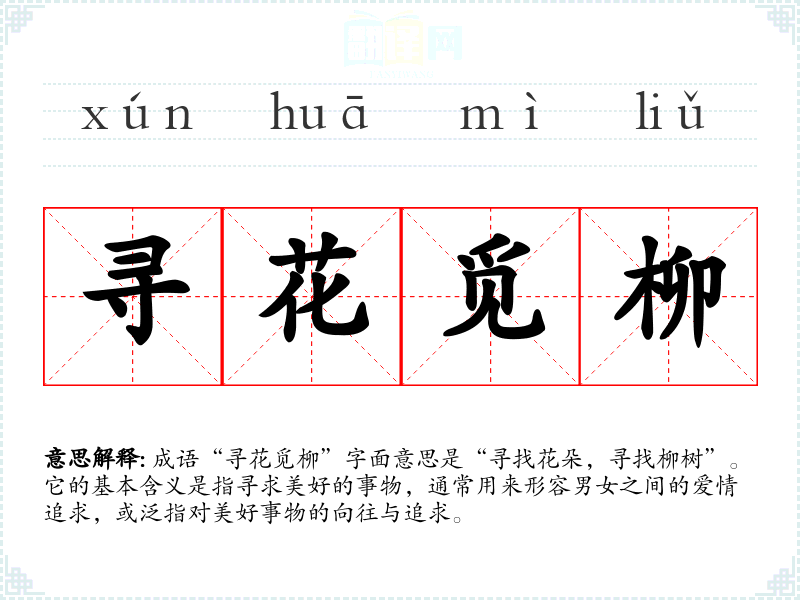 成语“寻花觅柳”字面意思是“寻找花朵,寻找柳树”。它的基本含义是指寻求美好的事物,通常用来形容男女之间的爱情追求,或泛指对美好事物的向往与追求。