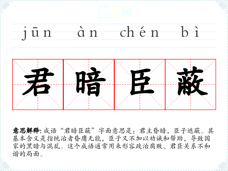 成语“君暗臣蔽”字面意思是:君主昏暗,臣子遮蔽。其基本含义是指统治者昏庸无能,臣子又不加以劝诫和帮助,导致国家的黑暗与混乱。这个成语通常用来形容政治腐败、君臣关系不和谐的局面。