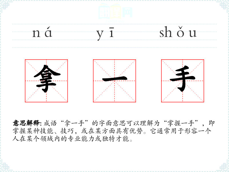 成语“拿一手”的字面意思可以理解为“掌握一手”,即掌握某种技能、技巧,或在某方面具有优势。它通常用于形容一个人在某个领域内的专业能力或独特才能。