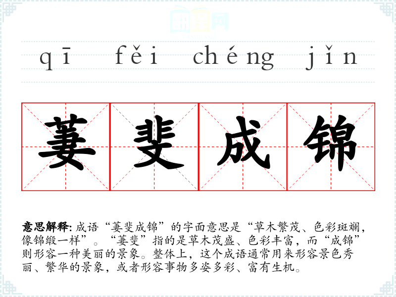 成语“萋斐成锦”的字面意思是“草木繁茂、色彩斑斓,像锦缎一样”。“萋斐”指的是草木茂盛、色彩丰富,而“成锦”则形容一种美丽的景象。整体上,这个成语通常用来形容景色秀丽、繁华的景象,或者形容事物多姿多彩、富有生机。
