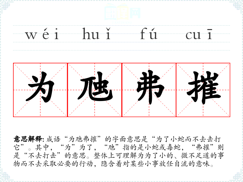 成语“为虺弗摧”的字面意思是“为了小蛇而不去击打它”。其中,“为”为了,“虺”指的是小蛇或毒蛇,“弗摧”则是“不去打击”的意思。整体上可理解为为了小的、微不足道的事物而不去采取必要的行动,隐含着对某些小事放任自流的意味。