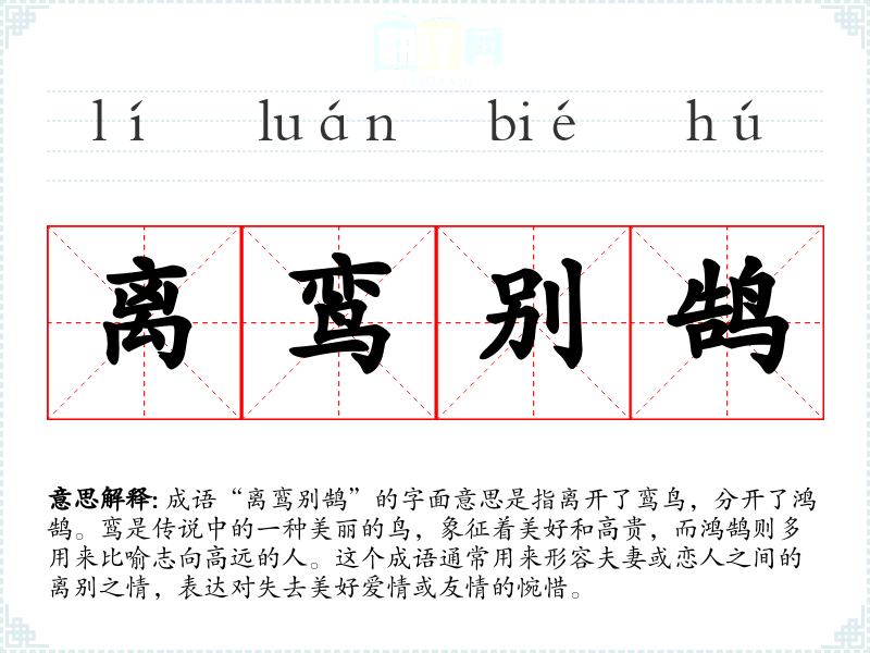成语“离鸾别鹄”的字面意思是指离开了鸾鸟,分开了鸿鹄。鸾是传说中的一种美丽的鸟,象征着美好和高贵,而鸿鹄则多用来比喻志向高远的人。这个成语通常用来形容夫妻或恋人之间的离别之情,表达对失去美好爱情或友情的惋惜。