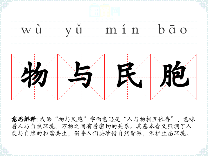 成语“物与民胞”字面意思是“人与物相互依存”,意味着人与自然环境、万物之间有着密切的关系。其基本含义强调了人类与自然的和谐共生,倡导人们要珍惜自然资源,保护生态环境。