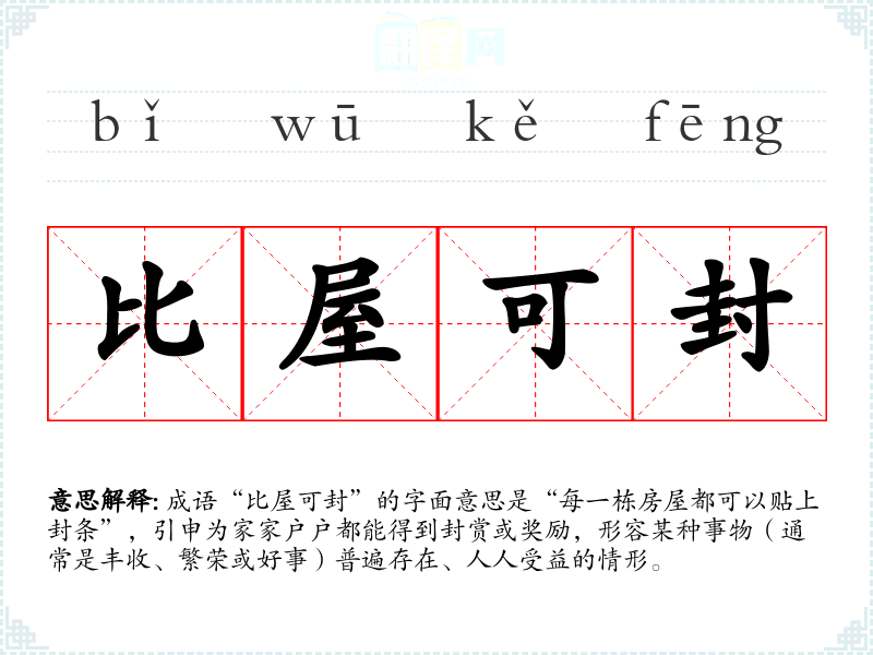 成语“比屋可封”的字面意思是“每一栋房屋都可以贴上封条”,引申为家家户户都能得到封赏或奖励,形容某种事物(通常是丰收、繁荣或好事)普遍存在、人人受益的情形。