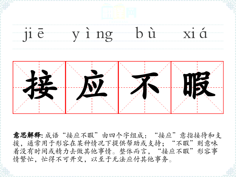 成语“接应不暇”由四个字组成:“接应”意指接待和支援,通常用于形容在某种情况下提供帮助或支持;“不暇”则意味着没有时间或精力去做其他事情。整体而言,“接应不暇”形容事情繁忙,忙得不可开交,以至于无法应付其他事务。