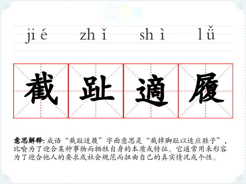 成语“截趾适履”字面意思是“截掉脚趾以适应鞋子”,比喻为了迎合某种事物而牺牲自身的本质或特征。它通常用来形容为了迎合他人的要求或社会规范而扭曲自己的真实情况或个性。