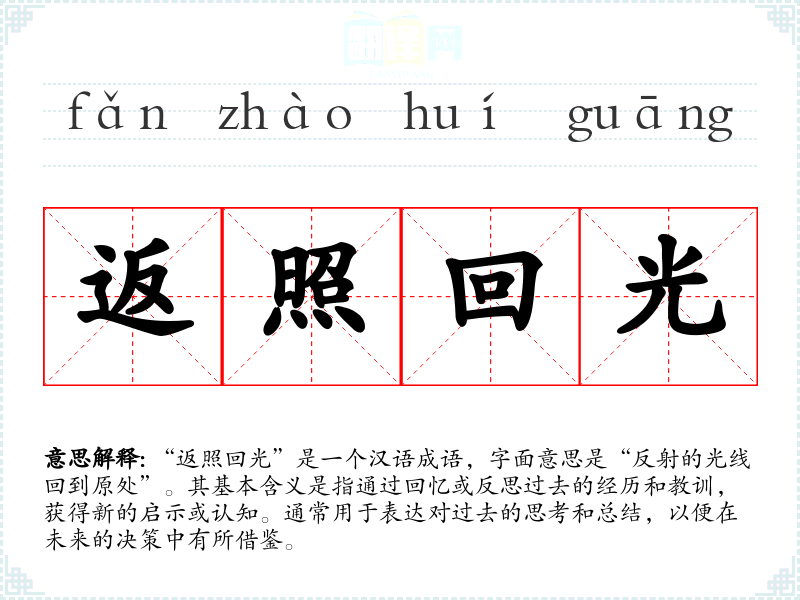 “返照回光”是一个汉语成语,字面意思是“反射的光线回到原处”。其基本含义是指通过回忆或反思过去的经历和教训,获得新的启示或认知。通常用于表达对过去的思考和总结,以便在未来的决策中有所借鉴。