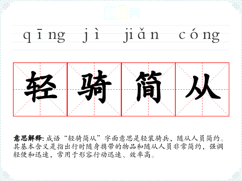 成语“轻骑简从”字面意思是轻装骑兵,随从人员简约。其基本含义是指出行时随身携带的物品和随从人员非常简约,强调轻便和迅速,常用于形容行动迅速、效率高。