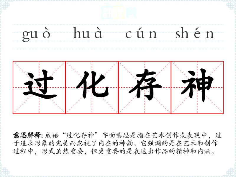成语“过化存神”字面意思是指在艺术创作或表现中,过于追求形象的完美而忽视了内在的神韵。它强调的是在艺术和创作过程中,形式虽然重要,但更重要的是表达出作品的精神和内涵。