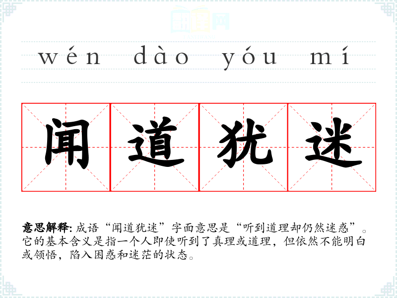 成语“闻道犹迷”字面意思是“听到道理却仍然迷惑”。它的基本含义是指一个人即使听到了真理或道理,但依然不能明白或领悟,陷入困惑和迷茫的状态。