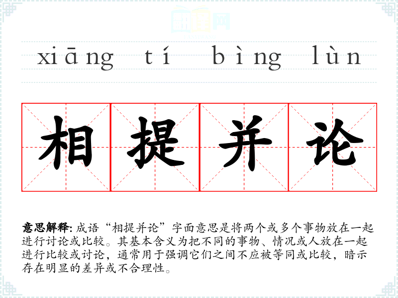 成语“相提并论”字面意思是将两个或多个事物放在一起进行讨论或比较。其基本含义为把不同的事物、情况或人放在一起进行比较或讨论,通常用于强调它们之间不应被等同或比较,暗示存在明显的差异或不合理性。