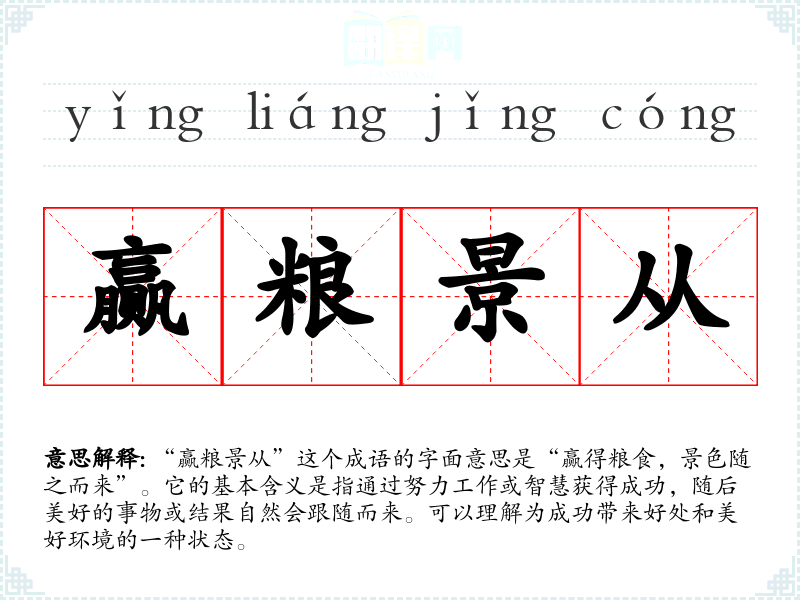 “赢粮景从”这个成语的字面意思是“赢得粮食,景色随之而来”。它的基本含义是指通过努力工作或智慧获得成功,随后美好的事物或结果自然会跟随而来。可以理解为成功带来好处和美好环境的一种状态。