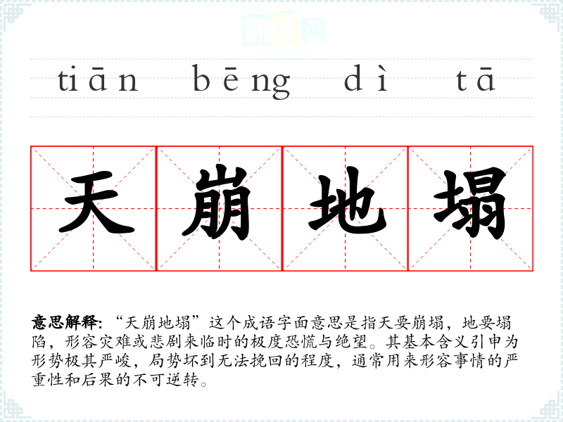 “天崩地塌”这个成语字面意思是指天要崩塌,地要塌陷,形容灾难或悲剧来临时的极度恐慌与绝望。其基本含义引申为形势极其严峻,局势坏到无法挽回的程度,通常用来形容事情的严重性和后果的不可逆转。