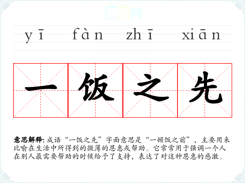 成语“一饭之先”字面意思是“一顿饭之前”,主要用来比喻在生活中所得到的微*的恩惠或帮助。它常常用于强调一个人在别人最需要帮助的时候给予了支持,表达了对这种恩惠的感激。
