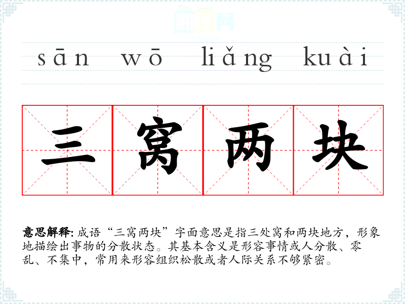 成语“三窝两块”字面意思是指三处窝和两块地方,形象地描绘出事物的分散状态。其基本含义是形容事情或人分散、零乱、不集中,常用来形容组织松散或者人际关系不够紧密。