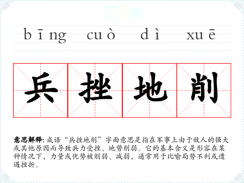 成语“兵挫地削”字面意思是指在军事上由于敌人的强大或其他原因而导致兵力受挫、地势削弱。它的基本含义是形容在某种情况下,力量或优势被削弱、减弱,通常用于比喻局势不利或遭遇挫折。