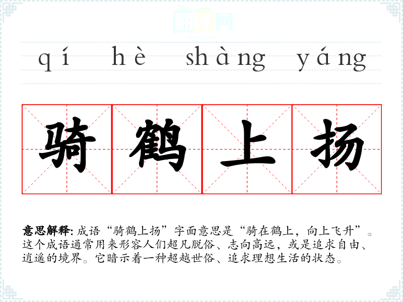 成语“骑鹤上扬”字面意思是“骑在鹤上,向上飞升”。这个成语通常用来形容人们超凡脱俗、志向高远,或是追求自由、逍遥的境界。它暗示着一种超越世俗、追求理想生活的状态。
