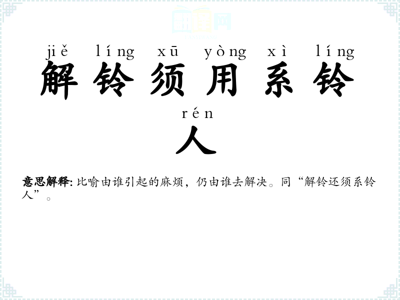 系:缚,系上。比喻谁惹出来的麻烦,还得由谁去解决。 |
