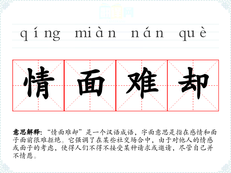 “情面难却”是一个汉语成语,字面意思是指在感情和面子面前很难拒绝。它强调了在某些社交场合中,由于对他人的情感或面子的考虑,使得人们不得不接受某种请求或邀请,尽管自己并不情愿。