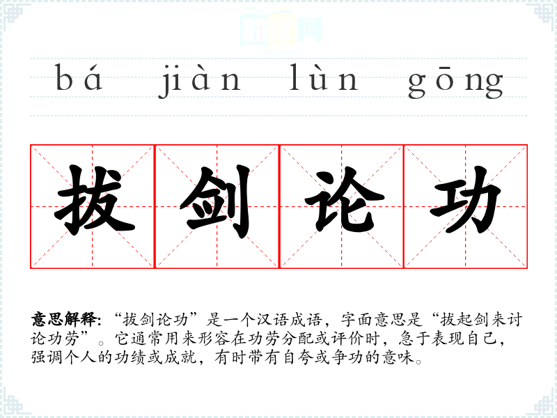“拔剑论功”并没有明确的历史典故或文学出处,但其字面意义可以追溯到古代军事文化中,拔剑象征着准备战斗或较量,而“论功”则是对功劳进行讨论和评估,体现了一种争夺功劳的态度。许多古代文学作品中都涉及到将军、英雄之间的功劳争议,这个成语可能是从这些情境中演化而来。