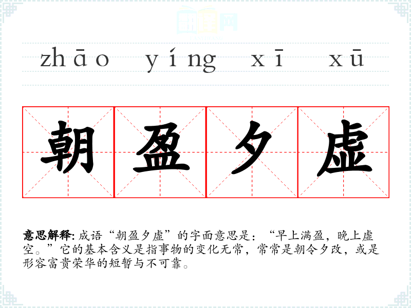成语“朝盈夕虚”的字面意思是:“早上满盈,晚上虚空。”它的基本含义是指事物的变化无常,常常是朝令夕改,或是形容富贵荣华的短暂与不可靠。