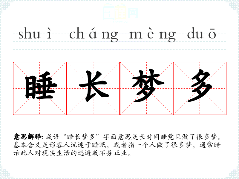 成语“睡长梦多”字面意思是长时间睡觉且做了很多梦。基本含义是形容人沉迷于睡眠,或者指一个人做了很多梦,通常暗示此人对现实生活的逃避或不务正业。