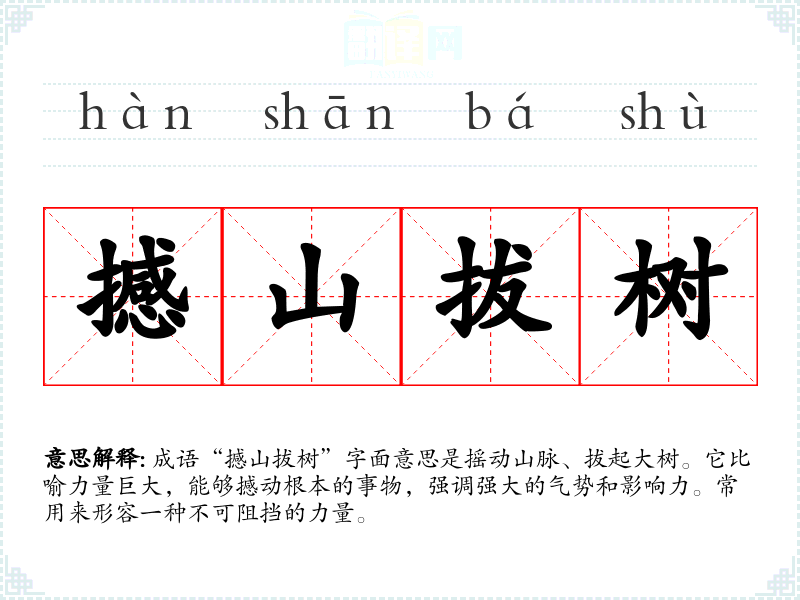 “撼山拔树”给人一种壮丽、雄伟的感觉,常常让人联想到英雄气概、震撼人心的场景。它激励人们追求力量与改变,鼓舞人心,激发斗志。