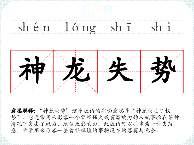 “神龙失势”这个成语的字面意思是“神龙失去了权势”。它通常用来形容一个曾经强大或有影响力的人或事物在某种情况下失去了权力、地位或影响力。此成语可以引申为一种失落感,常常用来形容一些曾经辉煌的事物现在的落寞与无奈。