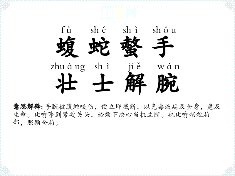 指勇士手腕被蝮蛇咬伤,就立即截断,以免毒性扩散全身。比喻作事要当机立断,不可迟疑、姑息。 |
