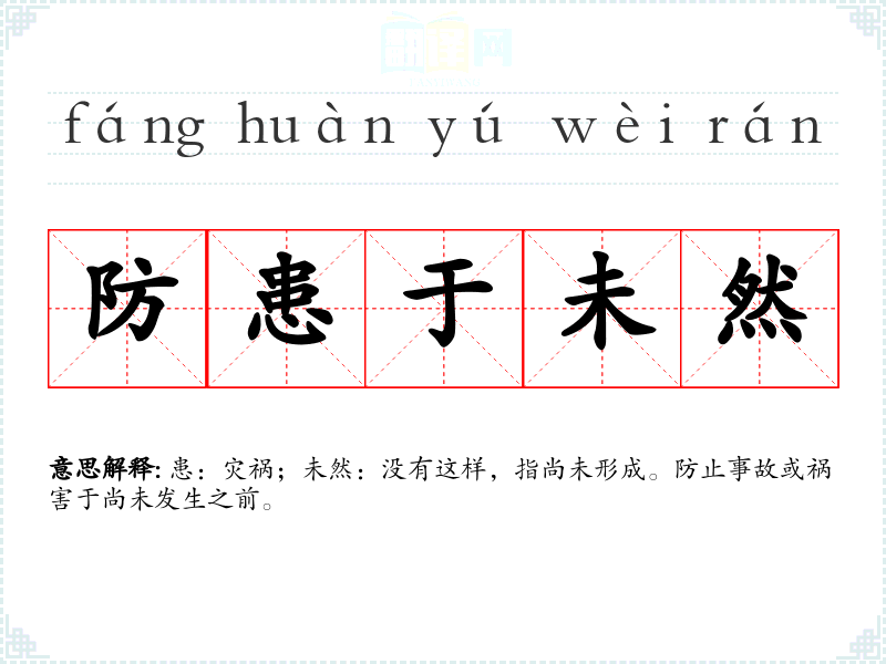 患:灾祸;未然:没有这样,指尚未形成。防止事故或祸害于尚未发生之前。 |