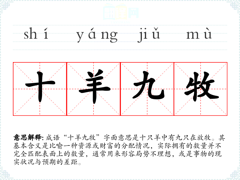 成语“十羊九牧”字面意思是十只羊中有九只在放牧。其基本含义是比喻一种资源或财富的分配情况,实际拥有的数量并不完全匹配表面上的数量,通常用来形容局势不理想,或是事物的现实状况与预期的差距。