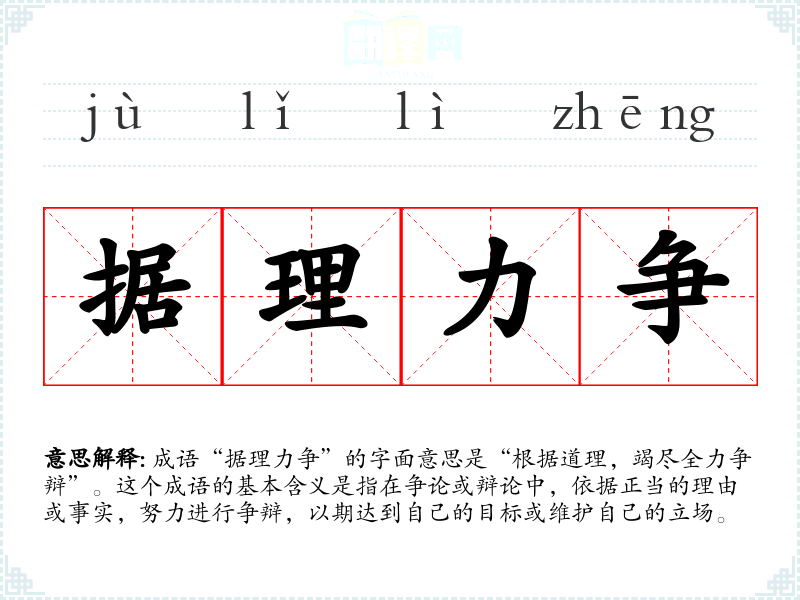 成语“据理力争”的字面意思是“根据道理,竭尽全力争辩”。这个成语的基本含义是指在争论或辩论中,依据正当的理由或事实,努力进行争辩,以期达到自己的目标或维护自己的立场。
