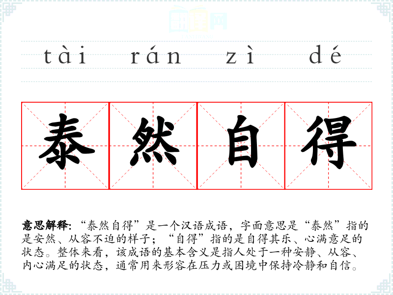 “泰然自得”是一个汉语成语,字面意思是“泰然”指的是安然、从容不迫的样子;“自得”指的是自得其乐、心满意足的状态。整体来看,该成语的基本含义是指人处于一种安静、从容、内心满足的状态,通常用来形容在压力或困境中保持冷静和自信。