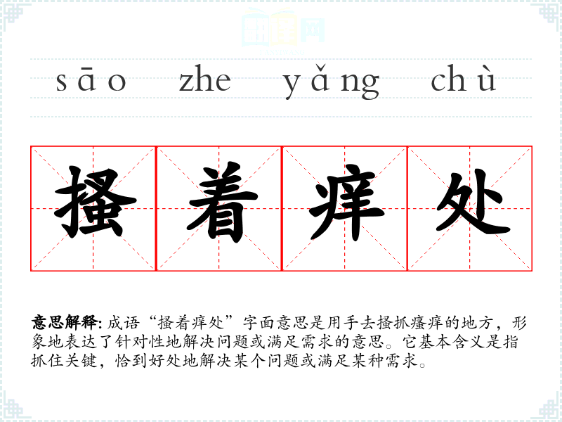 成语“搔着痒处”字面意思是用手去搔抓瘙痒的地方,形象地表达了针对性地解决问题或满足需求的意思。它基本含义是指抓住关键,恰到好处地解决某个问题或满足某种需求。