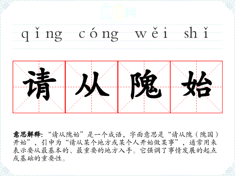 通过对“请从隗始”的学,我更加深刻地理解到,在任何事情的开始阶段,都要重视基础和起点的重要性。这不仅对语言学有帮助,也对生活中的许多方面提供了指导。这个成语提醒我,在追求目标时,扎实的基础是成功的关键。