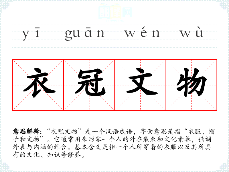 “衣冠文物”是一个汉语成语,字面意思是指“衣服、帽子和文物”。它通常用来形容一个人的外在装束和文化素养,强调外表与内涵的结合。基本含义是指一个人所穿着的衣服以及其所具有的文化、知识等修养。