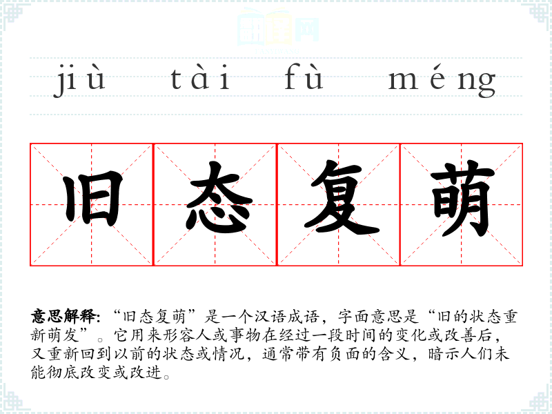 “旧态复萌”是一个汉语成语,字面意思是“旧的状态重新萌发”。它用来形容人或事物在经过一段时间的变化或改善后,又重新回到以前的状态或情况,通常带有负面的含义,暗示人们未能彻底改变或改进。