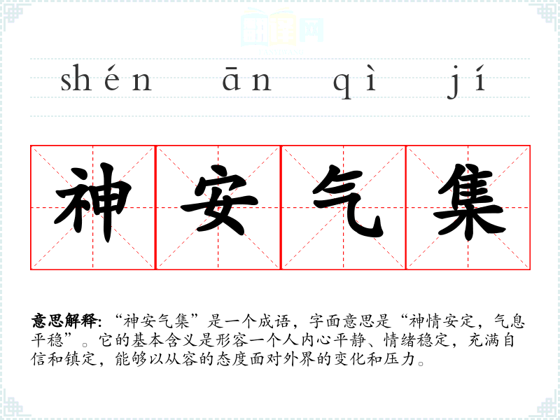 “神安气集”是一个成语,字面意思是“神情安定,气息平稳”。它的基本含义是形容一个人内心平静、情绪稳定,充满自信和镇定,能够以从容的态度面对外界的变化和压力。